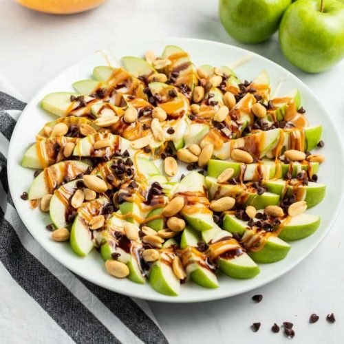 You can! Use diced apples in muffin batter and swirl caramel or chocolate in just before baking for that same apple nacho vibe. Adjust baking time to 18-22 minutes at 350°F and don’t forget to check with a toothpick. Muffins won’t have that same crunchy topping feel but make a great portable version.
