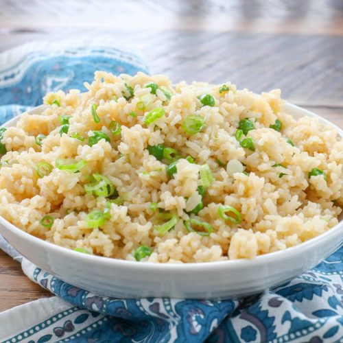 - Add the frozen peas if desired and stir to combine. The heat of the rice will cook them in just a minute or two. Taste the rice and add salt only if needed. Stir in the green onions, keep covered until serving. Enjoy!