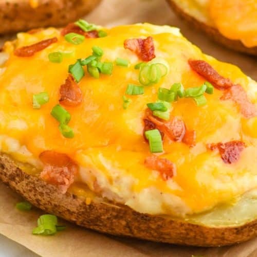 - Place the filled potato shells on a baking sheet. Bake for another 15-20 minutes, or until the tops are golden brown and the cheese is melted and bubbly.