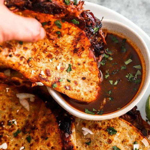 - Serve the birria tacos immediately, topped with chopped white onion and cilantro. Serve with lime wedges and a side of the warm consommé for dipping.