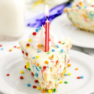 - Sprinkle the remaining 2 tablespoons of rainbow confetti sprinkles over the top of the pie. Slice into 8 servings and enjoy!
