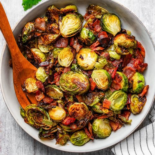 Give everything a final taste and adjust seasoning if needed. You might want a little more salt or pepper, depending on how salty your bacon was. Serve this delicious brussels sprouts bacon recipe immediately while it’s hot and crispy. The aroma alone will have everyone heading to the table!