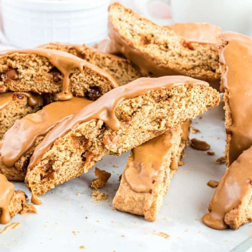 - For the caramel glaze, whisk together the powdered sugar, vanilla extract, espresso powder, and heavy whipping cream in a small bowl until smooth. Drizzle or spread the glaze over the cooled biscotti. Allow the glaze to set, about 15 minutes, before serving.