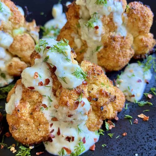 - Drizzle the creamy feta dressing over the roasted cauliflower wedges and serve immediately, optionally topped with chili pepper flakes.