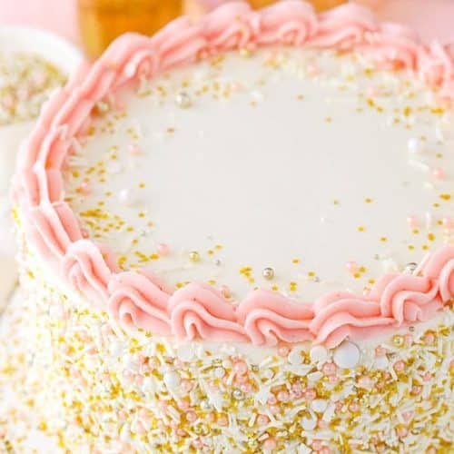 - 1 cup sprinkles pink sugar pearls and white and gold mix, for sides and top