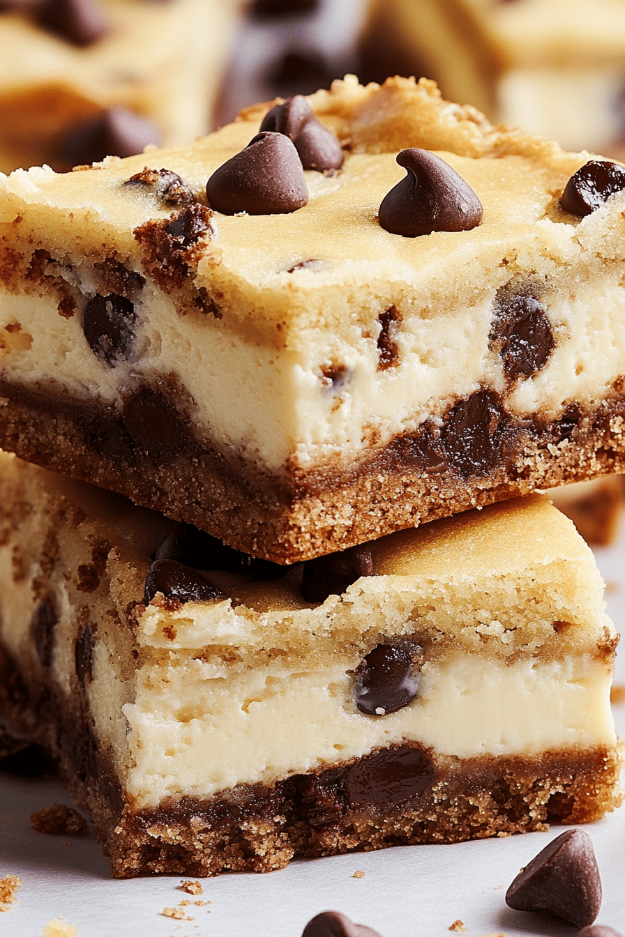 How do I make sure my Chocolate Chip Cookie Cheesecake Bars are perfect every time? What are some of my top tips?Butter & Cream Cheese Prep: What are some of the bestMake sure both butter and cream cheese are properly softened. What is the best way to get a smooth and creamy texture? If they’re too cold, they won’t cream properly, and you’ll end up with lumps in your batter. I usually take them out of the fridge about an hour before baking.Mixing Advice:Be careful not to overmix the cookie dough or the cheesecake filling. Overmixing can develop the gluten in the flour, resulting in tough cookies. For the cheesecake filling, overmixing can incorporate too much air, which can cause it to be too thick. Can crack during baking? Mix until just combined.Chocolate Chips: What is your choiceWhat is the best chocolate flavor? I like to use semi-sweet and milk chocolate chips, but you can use your favorite. Can you experiment with different types of chocolate chips, like dark chocolate or white chocolate?Oven Positioning: Bake the bars in the center rack of your oven for even baking. If the top of the bars starts to brown too quickly, you can tent them with foil to prevent burning.
