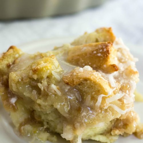 One of the best things about this Coconut Cream Bread Pudding is how well it stores and reheats. If you have any leftovers (which is rare in my house!), you can leave it at ROOM TEMPERATURE for up to 2 hours, especially if it’s not too warm in your kitchen. After that, it’s best to transfer it to an airtight container. For REFRIGERATOR STORAGE, once it’s cooled down, place it in a sealed container or cover the baking dish tightly with plastic wrap or foil. It should stay delicious for about 3-4 days. The glaze will likely become a bit more matte and set after refrigeration, which is perfectly fine. If you want to FREEZE it, I recommend doing so before glazing, or after the glaze has fully set. Wrap individual portions or the whole dish tightly in plastic wrap, then a layer of aluminum foil, or place in a freezer-safe container. It can be frozen for up to 2-3 months. To thaw, it’s best to bring it to room temperature overnight in the refrigerator, then allow it to come to room temperature for about 30 minutes before reheating. For REHEATING, the best way is to warm it gently in the oven at around 300°F (150°C) for about 10-15 minutes, or until heated through. This helps restore some of that lovely tender texture. You can also reheat individual portions in the microwave for about 30-60 seconds, but be careful not to overheat, as it can become rubbery. If you plan on storing it for a while and reheating, I often recommend adding the glaze *after* reheating, just before serving, to keep it looking its freshest. Some people even like to add a fresh drizzle of glaze or a dollop of whipped cream when serving leftovers, which makes it feel like a fresh bake!