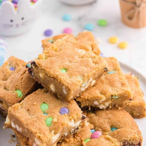 - Stir in flour, baking soda, and salt until just combined. Then fold in white chocolate chips and pastel M&Ms.
