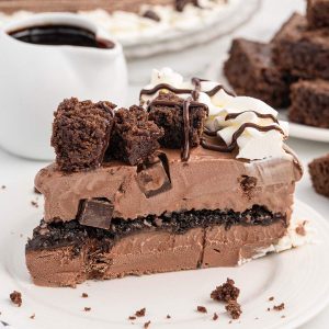 - Microwave the hot fudge sauce for 15 seconds to soften. Stir well, then spread evenly over the chocolate ice cream layer.12 chocolate sandwich cookies chocolate creme filled
