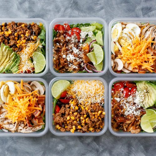 - When ready to eat, take a container of prepped greens and vegetables. Add your chosen protein and any desired toppings such as beans, corn, cheese, and Fritos.