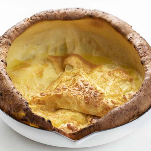 - Immediately pour the batter into the hot skillet and return it to the oven. Bake for 20 minutes, or until the pancake is puffed and golden brown around the edges. Do not open the oven door during baking to prevent collapsing.