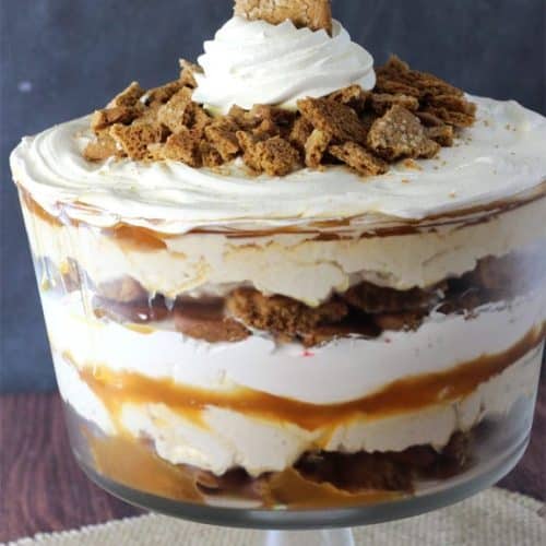 - To a large trifle dish add about half of the gingerbread cookies. Spread into an even layer. Break them into pieces first to help them fit.
