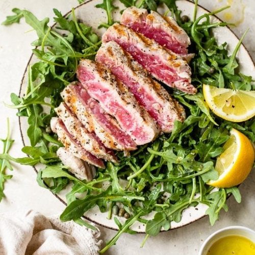 - Slice the grilled tuna diagonally. Place the sliced tuna on top of the arugula and capers. Drizzle with the lemon vinaigrette and serve immediately.