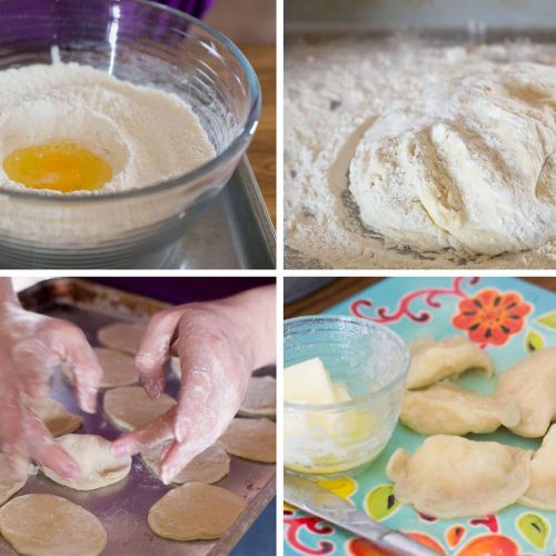 - Lightly flour a clean surface. Divide the dough into 4 portions. Roll out one portion thinly (about 1/8-inch thick). Cut out circles using a round cutter (about 3 inches in diameter).