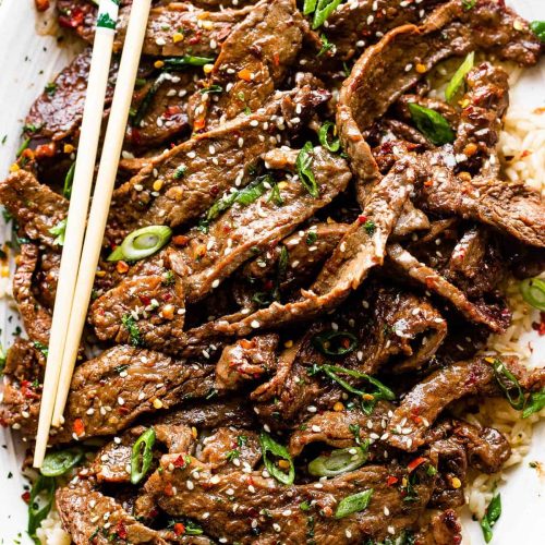 – 1 1/2 to 2 pounds flank steak or sirloin, thinly sliced against the grain