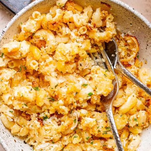 - Remove breadcrumb topping from heat and sprinkle evenly over the macaroni mixture.