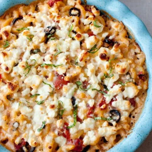 If you’re a lazy-layered person, simply mix the pasta and filling together and spoon into the dish. If you’re feeling fancy, you can do layers: pasta, dollops of filling, more pasta, then a final layer of sauce. A few swirls with a fork will create pretty ribbons of white and red. The important thing is to keep some filling visible so each bite has that tangy feta bite and the spinach glow.