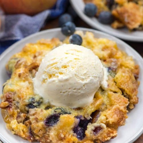 - Pour the peach pie filling, drained peaches, and blueberries into a 9x13-inch baking dish. Spread evenly, then sprinkle the yellow cake mix on top in an even layer.