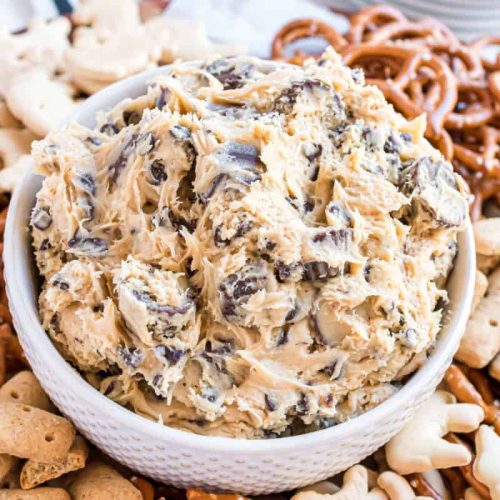 This creamy peanut butter cookie dough dip is packed with chocolate chips and Reese's mini peanut butter cups for an irresistible sweet and salty treat. Perfect for parties or snacking with pretzels and crackers.