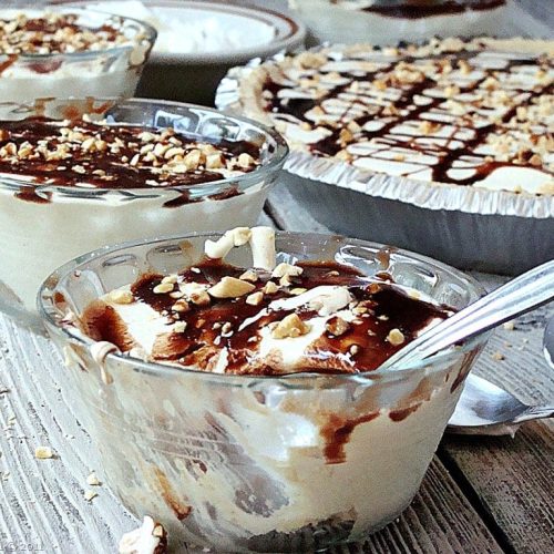 - Spoon the peanut butter mixture evenly into the two 9-inch graham cracker pie shells. Cover and freeze for at least 3 hours or until firm.