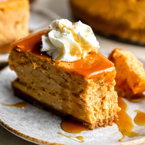 When ready to serve, carefully run a thin knife around the edge of the springform pan to loosen the cheesecake before releasing the sides of the pan. Slice with a sharp knife dipped in hot water and wiped dry between each cut for clean slices. Serve chilled or at room temperature. It’s divine on its own, but a dollop of whipped cream or a drizzle of caramel sauce is never a bad idea!
