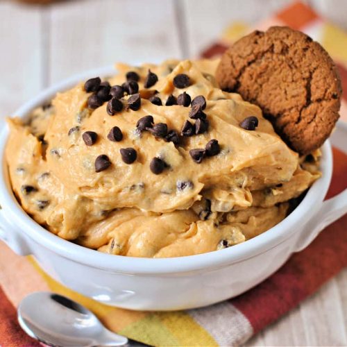 This dip isn’t sliced, but served! Spoon it into a nice bowl. I love serving it with a variety of dippers. Think graham crackers, shortbread cookies, apple slices, pear slices, pretzels, or even just a spoon for digging in! The combination of crunchy, sweet, and soft dippers is just divine with the creamy pumpkin cookie dough dip.