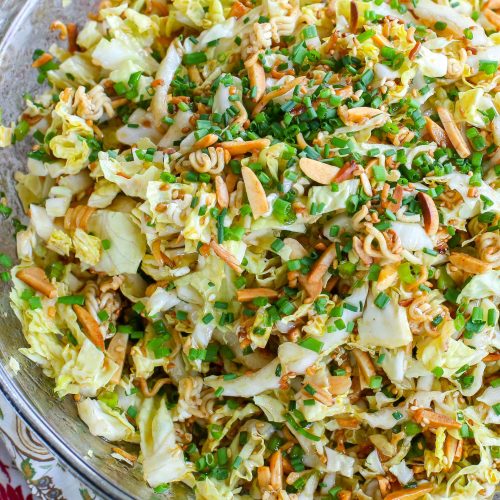 While this salad is great fresh, I sometimes let it chill for 10-15 minutes to let the flavors meld, but make sure you add the ramen last if chilling to keep the crunch bright. Serve straight from the bowl and watch it disappear!
