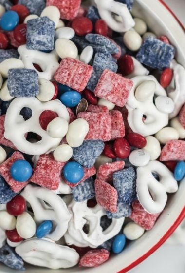 - In a large bowl, combine the red and blue Chex cereal, yogurt-covered pretzels, M&Ms, and yogurt-covered raisins. Gently stir to evenly distribute all the ingredients.