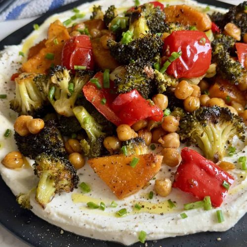 This dish is best served warm, right out of the oven. Garnish with a sprinkle of fresh chopped parsley or basil for a pop of green and extra freshness. A little drizzle of good quality olive oil or a pinch of red pepper flakes for a hint of heat can be lovely too. It’s beautiful as is, with those creamy dollops against the vibrant roasted vegetables.