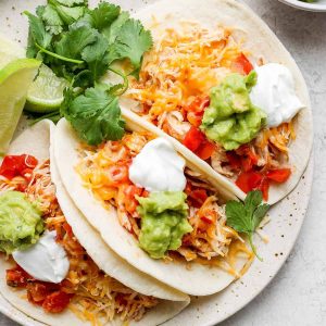 - Serve the slow cooker salsa chicken in warm tortillas topped with guacamole, fresh cilantro, minced red pepper or tomato, and sour cream as desired.
