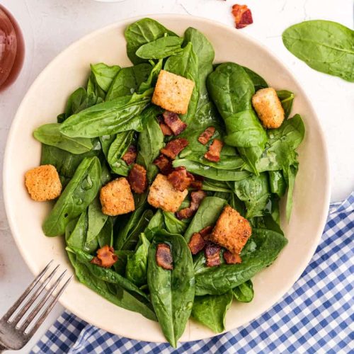 - To serve, place spinach and bacon bits in a large bowl. Top with croutons and drizzle with the chilled dressing. Toss lightly and enjoy!