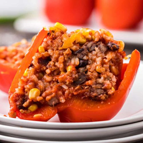 Freezer Instructions: Stuffed peppers freeze beautifully. Freeze unbaked by filling the peppers and placing them on a baking sheet to freeze solid, then transfer to a freezer-safe bag. Bake from frozen, adding 10–15 minutes to the total bake time. If you freeze after baking, they’ll keep 2–3 months and reheat well in the oven covered with foil to prevent drying out.